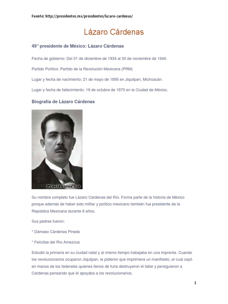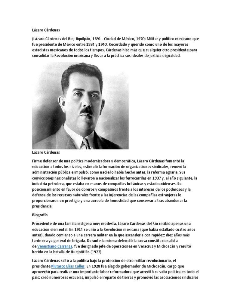 La biografia de lazaro cardenas corta. Lázaro Cárdenas del Río fue un militar y político mexicano. Nació el 21 de mayo de 1895 en Jilquilpan Michoacán. Somos seres humanos tenemos ideas diferentes y podemos tener una convivencia con respeto y tolerancia. Familia Fue el mayor de los ocho hijos de Dámaso Cárdenas y de Felicitas del Río. La historia de la Tercera Internacional la comunista no tendría la importancia que posee de no haber sido su misión integrar a los partidos comunistas a los sindicatos obreros al campesinado a los intelectuales y a la juventud en una magna organización mundial para derrotar al capitalismo y reemplazarlo por el socialismo. Biografia De Lazaro Cardenas.