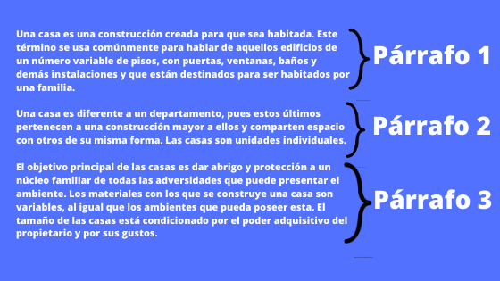 Las estructuras que se utilizan en la escritura actualmente van más allá de seguir el tradicional proceso de inicio nudo y desenlace ya que se concentran en el análisis y las relaciones entre conceptos. Un ejemplo de un. Los párrafos se reconocen en medio de un texto porque inician siempre con una mayúscula la de su primera oración contenida y sobre todo porque finalizan con un punto y aparte señal inequívoca de que se pasará a otro tema o a otro conjunto de informaciones del mismo tema. Es un componente del texto que en su aspecto externo comienza con una mayúscula y termina en un punto y aparte. Lee el siguiente párrafo e identifica las fallas que contiene. Las oraciones en español se forman colocando el sujeto al.